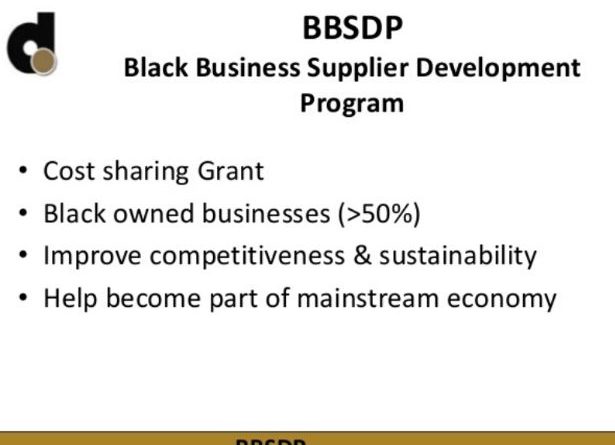 The Black Business Supplier Development Programme is a cost-sharing grant offered to black-owned small enterprises to assist them to improve their competitiveness and sustainability to become part of the mainstream economy and create employment.